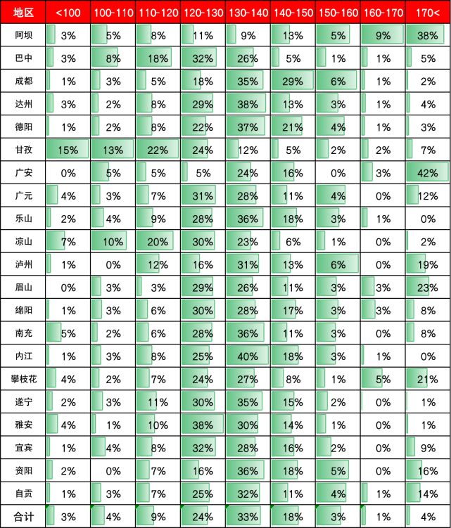成都市,笔试分数总分小于100的有1%,笔试分数在100-110的有3%,笔试分数在120-130的有18%,笔试分数在130-140的有35%,笔试分数在140-150的有29%,超过160分的还有3%的考生。
